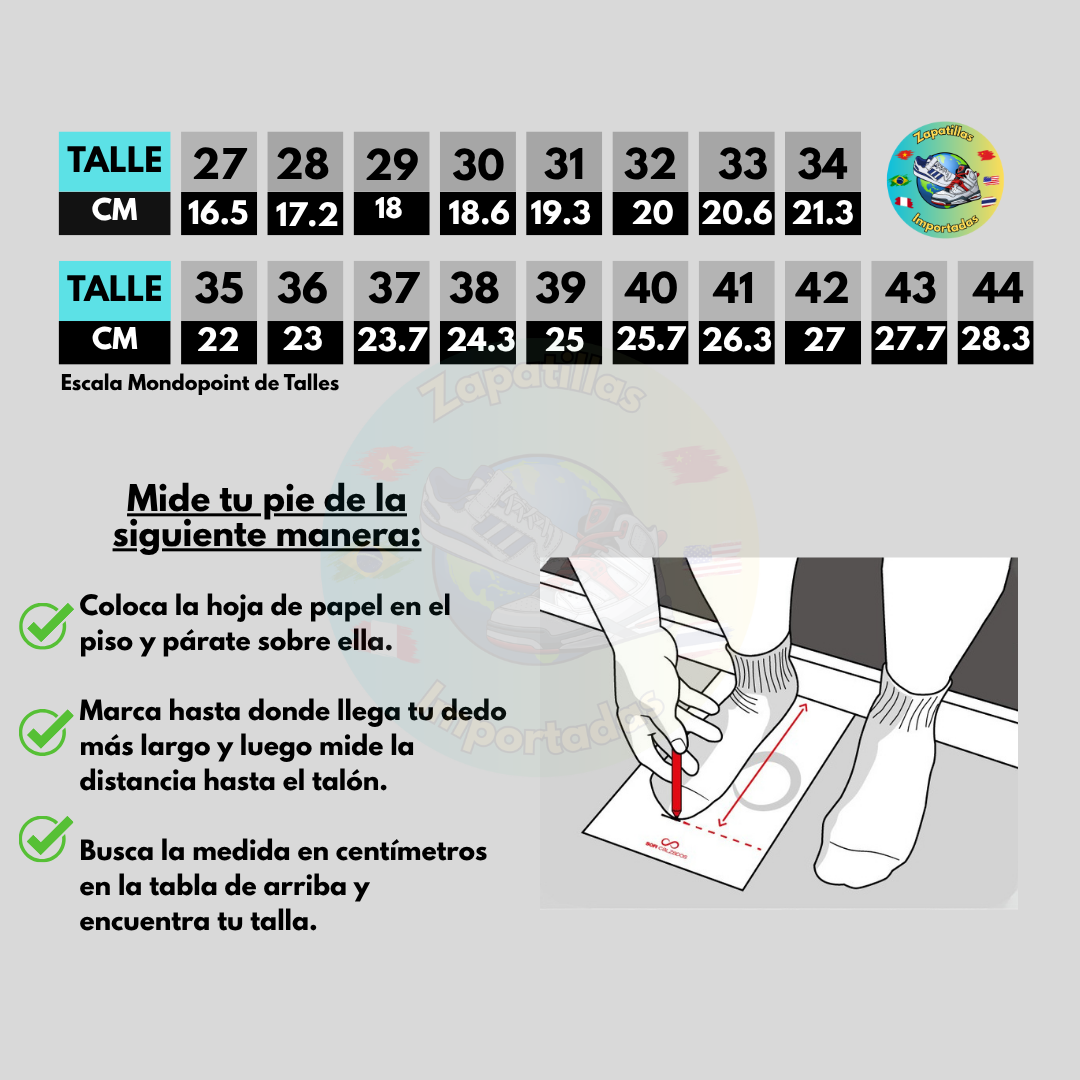 📏 Elegí tu talle con confianza: Antes de hacer tu pedido, te recomendamos medir el largo de tu pie apoyándolo contra una pared, para elegir el talle correcto según nuestra tabla de medidas. Como se indica en la imagen de arriba. De esa forma evitás errores y recibís el calzado perfecto desde el primer envío.Y si al recibirlo el talle no te queda como esperabas, no te preocupes:👉 El cambio por talle es 100% gratis.Nosotros nos encargamos de la devolución y del nuevo envío, sin costo adicional.